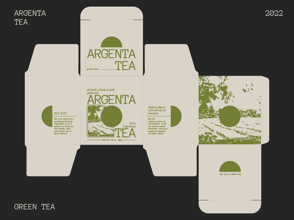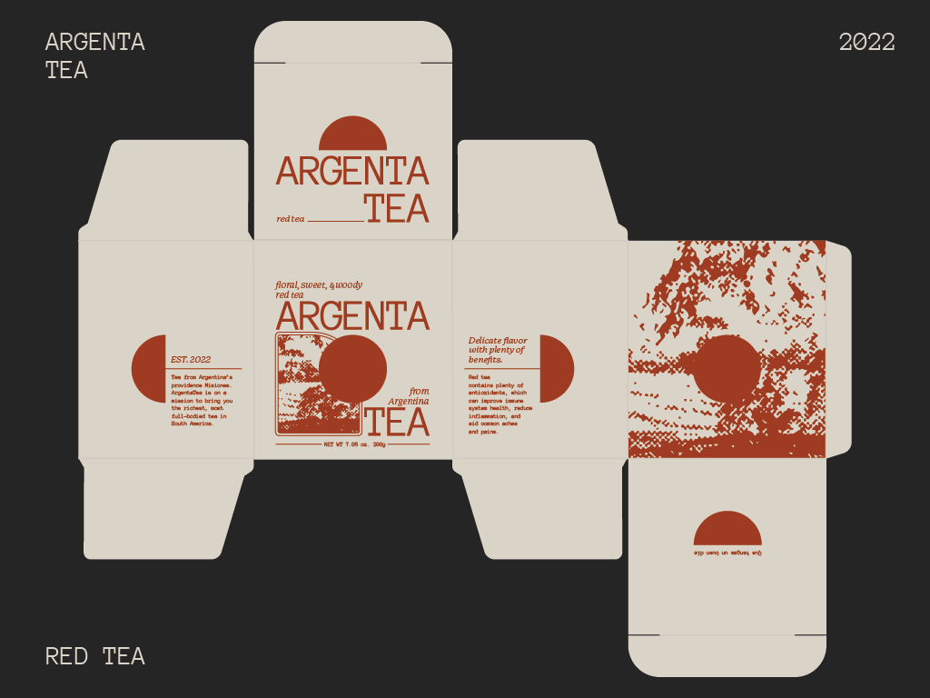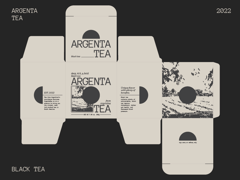 Packaging collection for Argenta Tea. The design shares the deep, rich, and bold characteristics of Argenta’s teas, from its deep and rich monochromatic colors, to its bold typographic treatment.